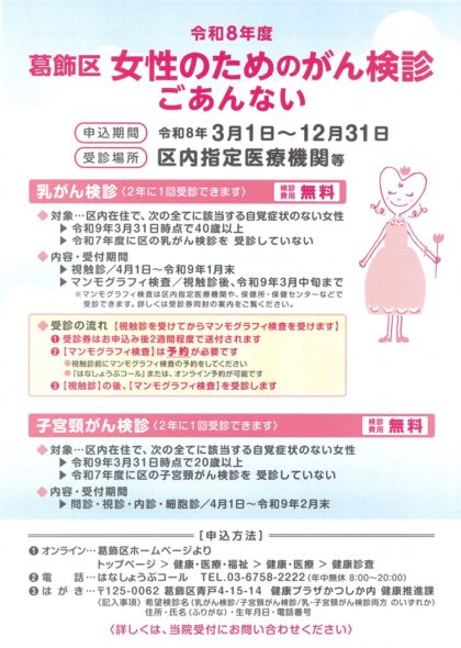 葛飾区がん検診(乳癌、子宮頸がん)、葛飾区骨粗しょう症予防検診を6月2日より開始します。